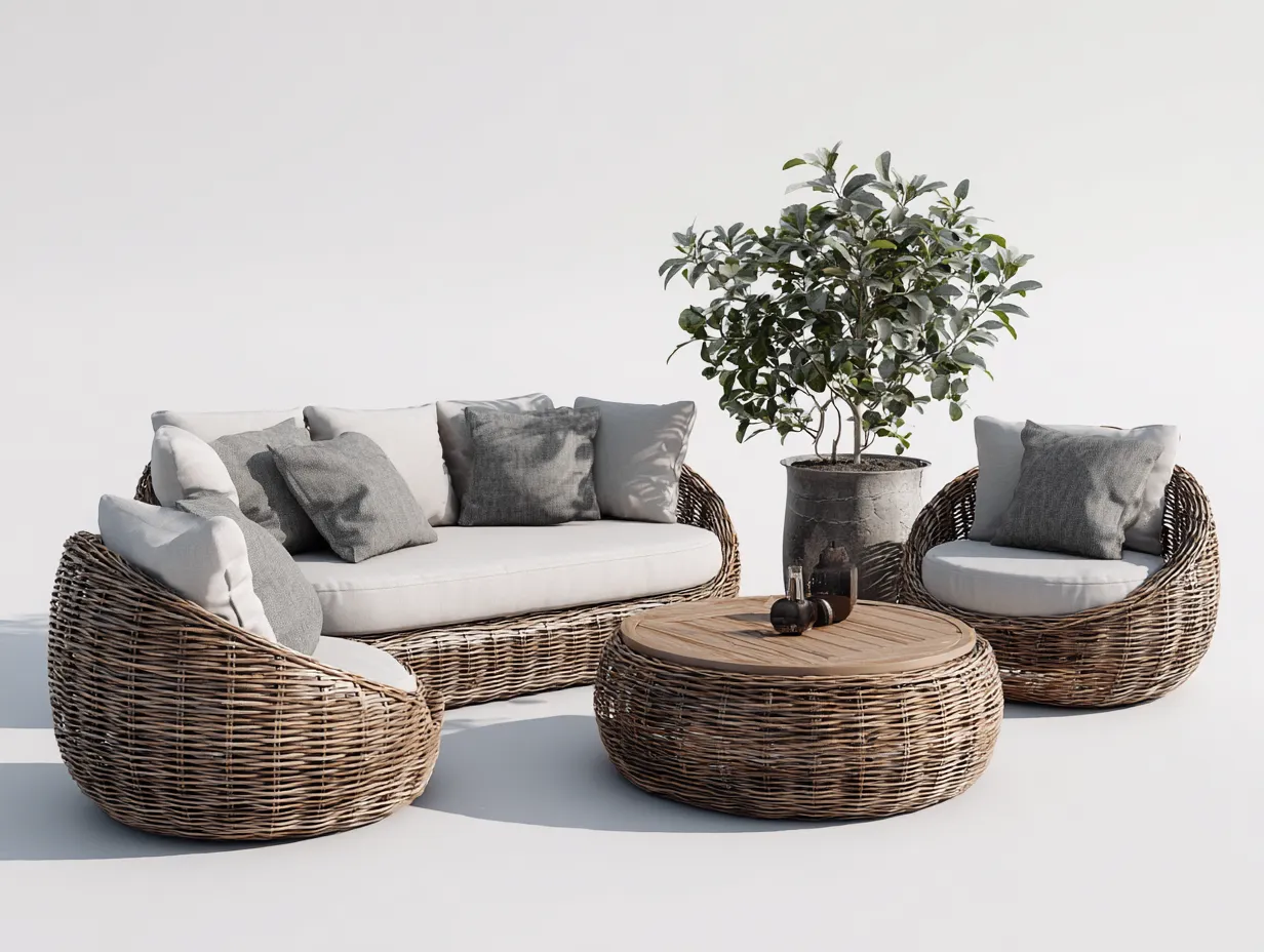 Canapé de jardin en rotin tressé 1 canapé 2 fauteuils et table basse 200x85x75 cm et 85x85x75 cm et 90x90x45 cm - Gris - Naturel - Style naturel